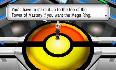 Before you go Korrina says that to get the Mega Ring, you will have to go to the top of the Tower of Mastery and battle her again. This time she wants to use her Lucario using Mega Evolution, and when you defeat her, you too will be able to start using Mega Evolutions. To exit the gym, skate down where Korrina went. There is a rail going south there which you should jump on to take you to the exit. Head on back to the Tower of Mastery where Mega Evolution awaits!